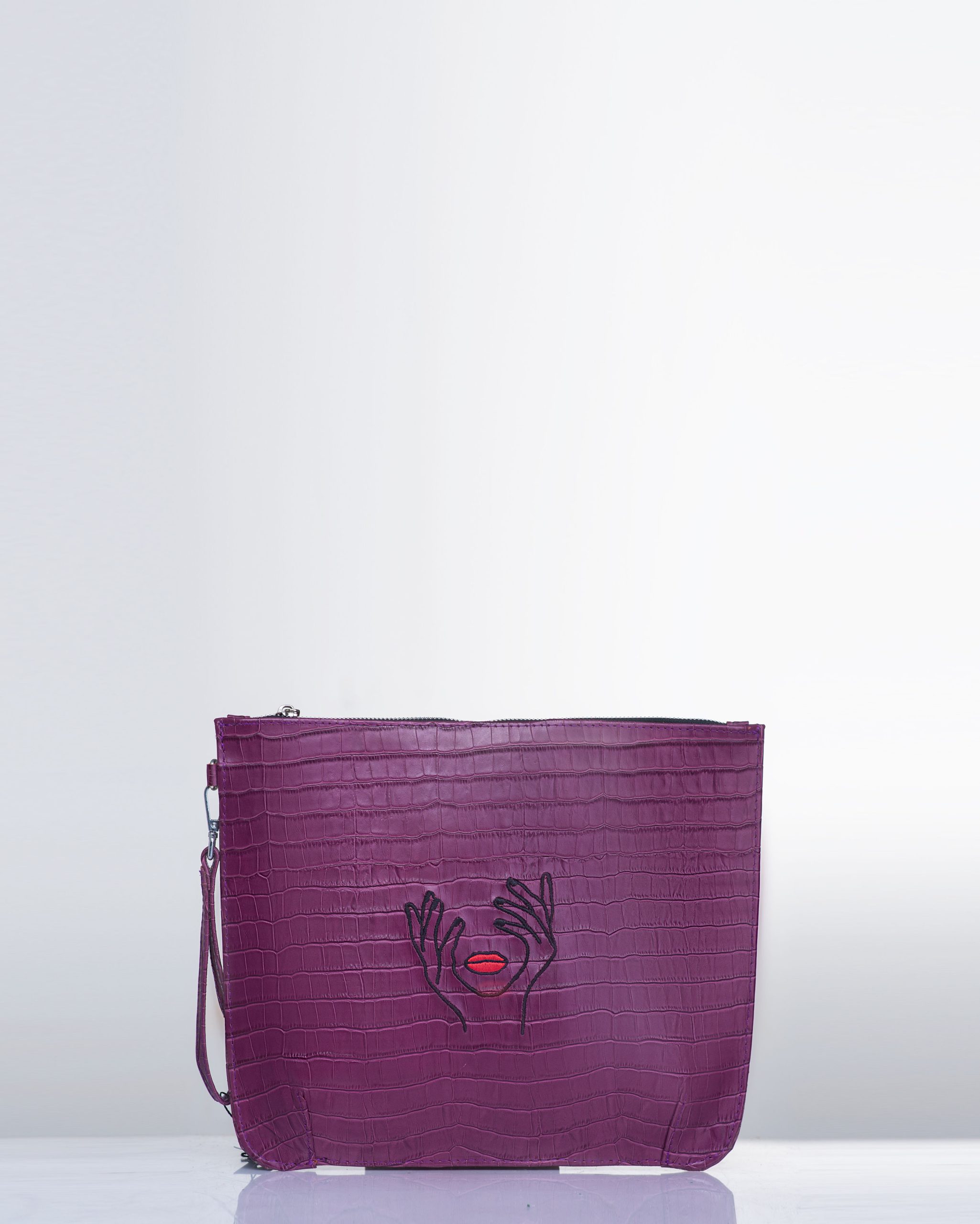 The Kayla leather pouch is designed to keep your tablet and everyday essentials safe in style. Made from premium leather with clean line art embroidery, it has a smooth zipper closure and a detachable wristlet strap for easy carrying.