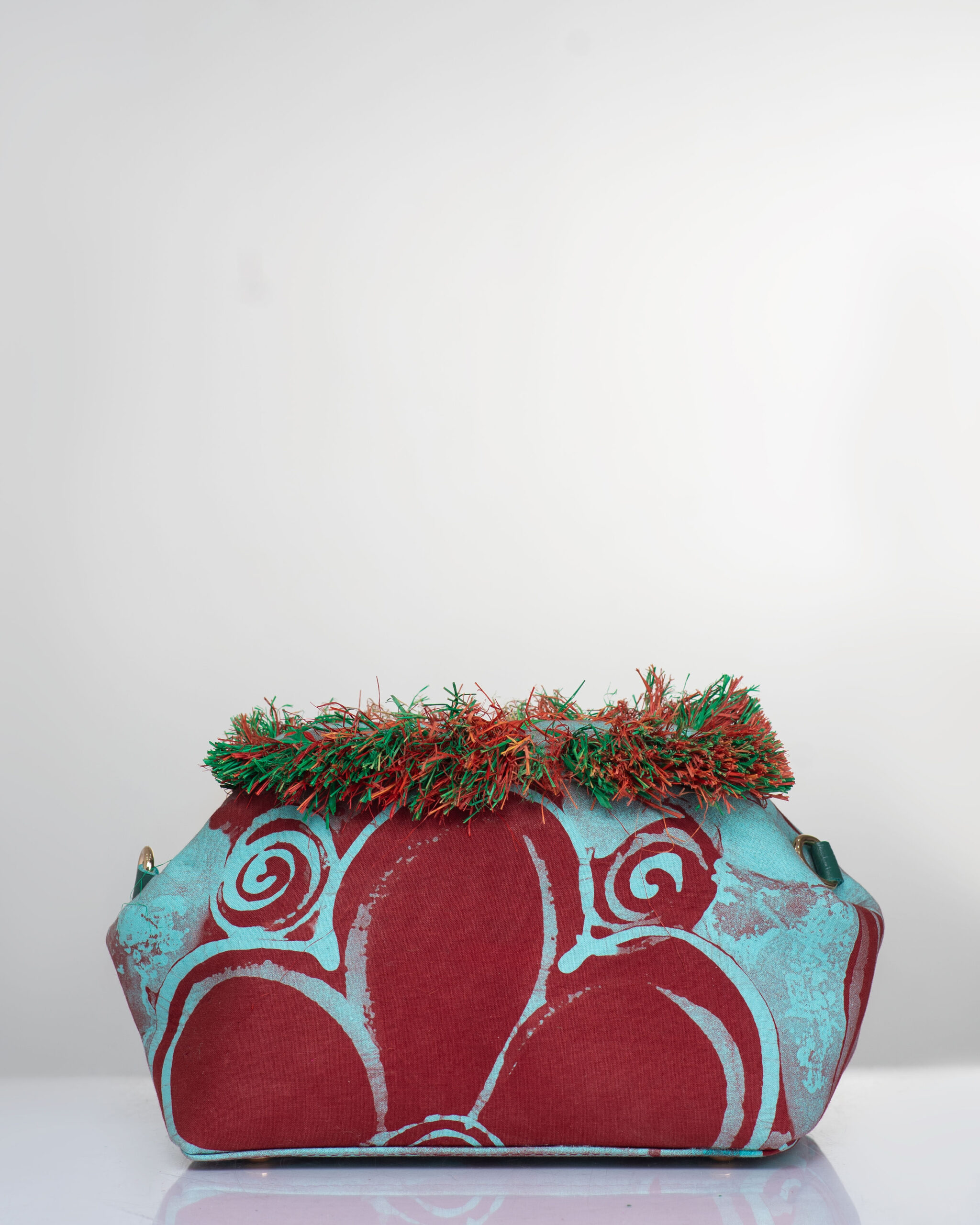 Crafted from richly hand-dyed adire fabric, this statement clutch bursts with bold patterns in bold hues, elevated with playful textured detailing along the top edge. Its striking silhouette makes it the perfect companion for evenings out, or whenever you want your accessories to do the talking.